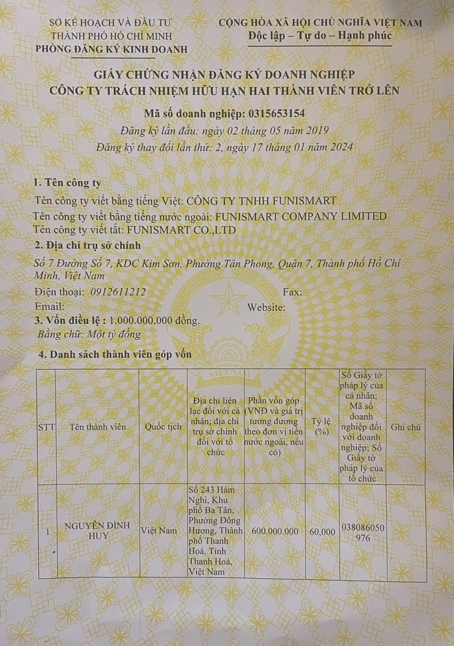 - Tên đăng kí kinh doanh: CÔNG TY TNHH FUNISMART (FUNISMART COMPANY LIMITED)